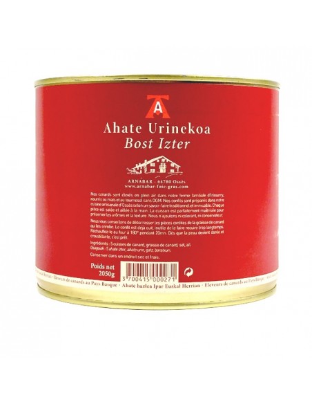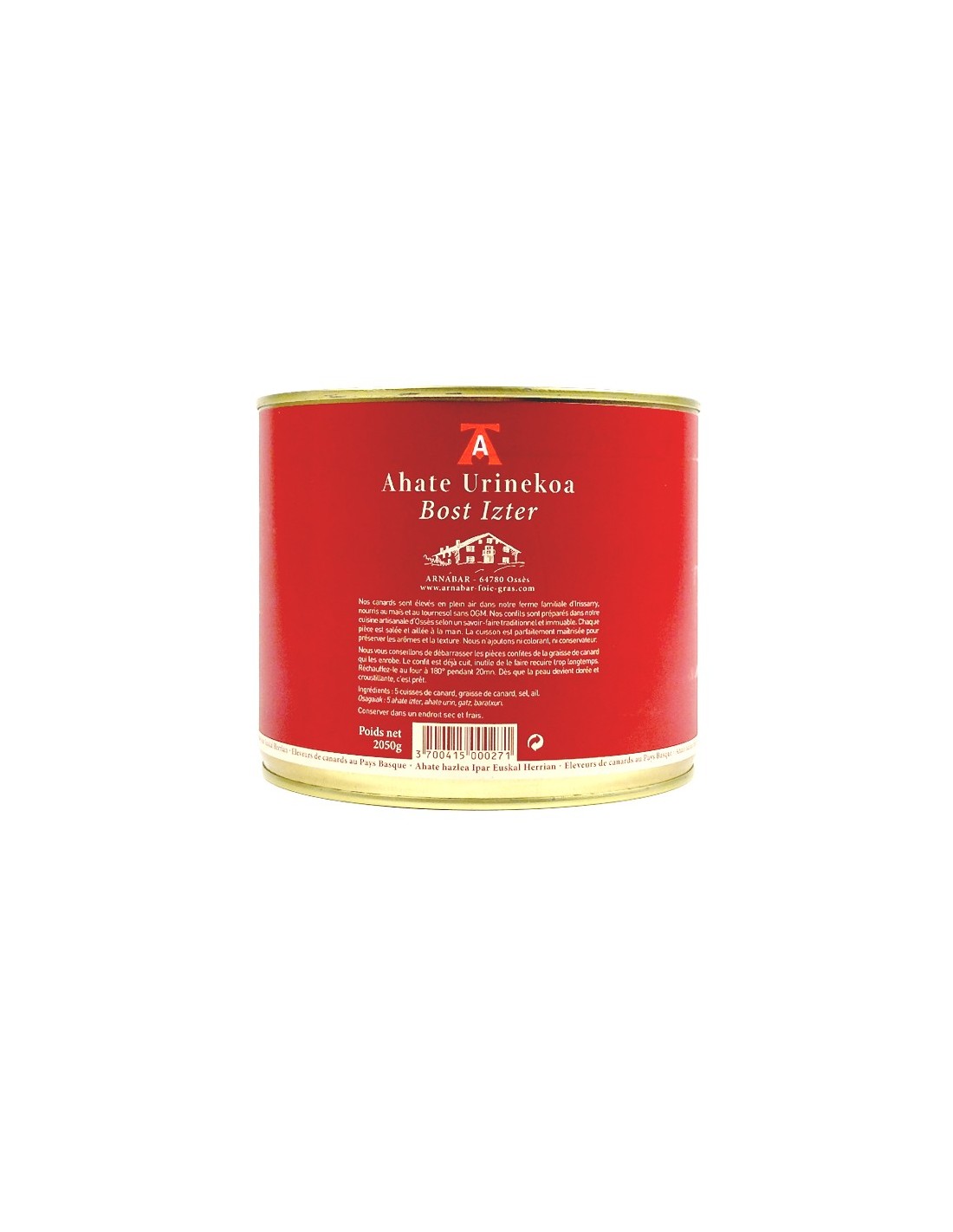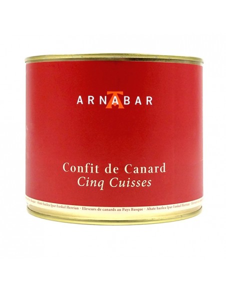 Eguneroko apairuentzat edo azken momentuan antolatutakoentzat bikaina, produtu hau etxeko apaletan edukitzeko egina da! Arnabar ahateen izterrak, lodi eta xamurrak, tripazale haundien plazerra asetzeko eginak. Gure ahateak kanpoan heziak dira, transgenikorik gabeko arto eta ekilore haziekin, gure familiako Arnabar baserrian, Irisarrin. Konfitatuak ahatik, Ortzaizeko kontserba-dendan artisauki sukaldatuak dira familiako jakintza tradizonalak segituz. Zati bakoitzak eskuz gatzituak dira, eta egosteari kasu berezia ematen diogu lurrinak eta testurak gordetzeko.