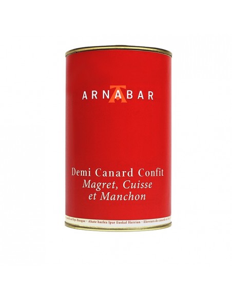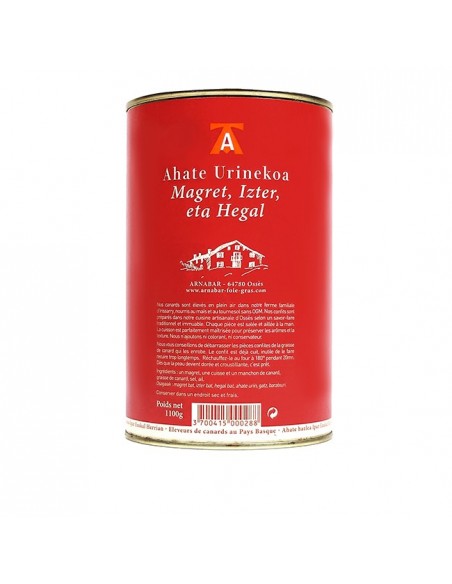 Hemen aurkituko duzu ahate erdi bat; bular, izter eta hegalarekin osatua! Gure ahateak kanpoan heziak dira, transgenikorik gabeko arto eta ekilore haziekin, gure familiako Arnabar baserrian, Irisarrin. Konfitatuak ahatik, Ortzaizeko kontserba-dendan artisauki sukaldatuak dira familiako jakintza tradizonalak segituz. Zati bakoitzak eskuz gatzituak dira, eta egosteari kasu berezia ematen diogu lurrinak eta testurak gordetzeko.