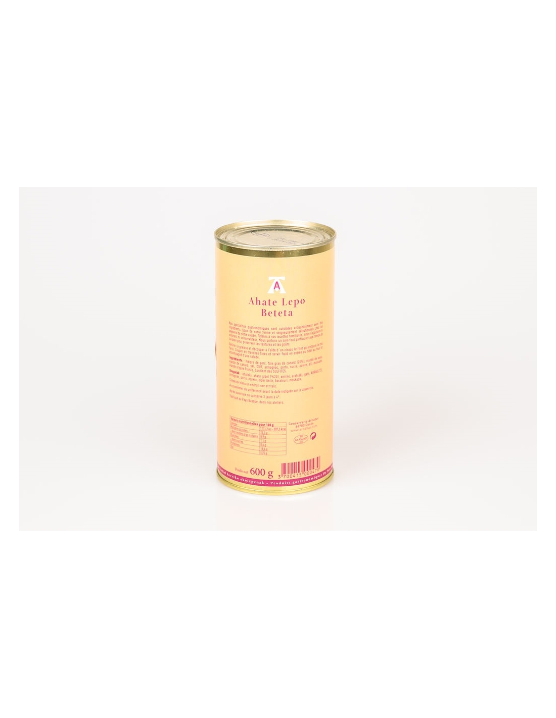 Ahate lepo betea 20% gibelarekin - 580 gr, gure Ipar Euskal herriko kontserba-tailerrean ekoitzia.