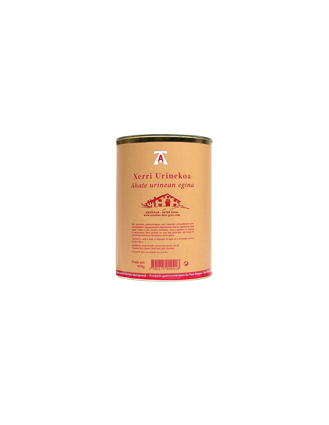 Xerriki azpia, ahate urinean konfitatua - 950 gr, gure Ipar Euskal Herriko kontserba-tailerrean ekoitzia.