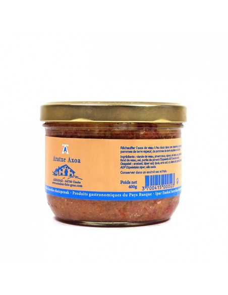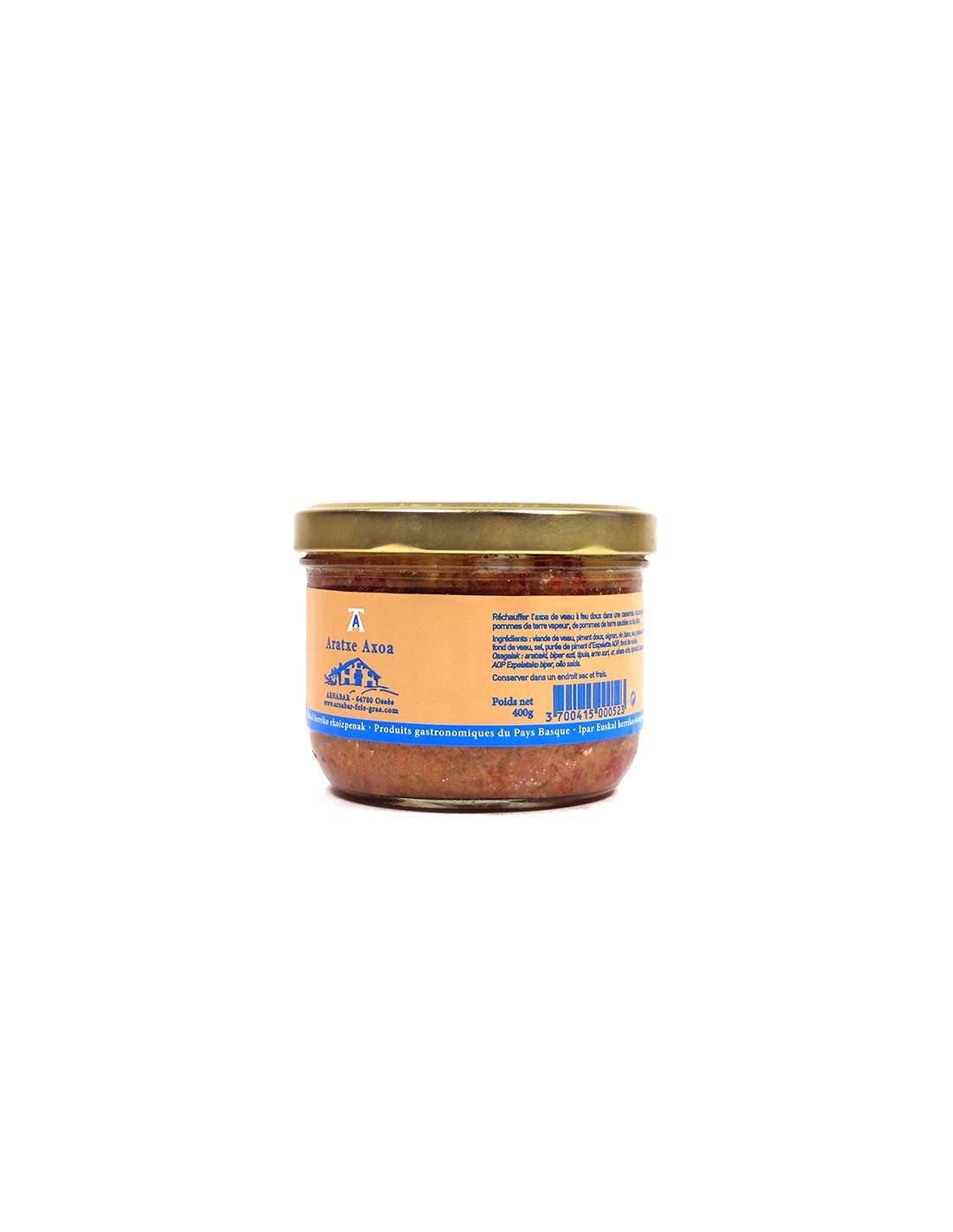 Aratxeki Axoa - ganibetaz moztutako haragiarekin - 400 gr, gure Ipar Euskal Herriko kontserba-tailerrean ekoitzia.