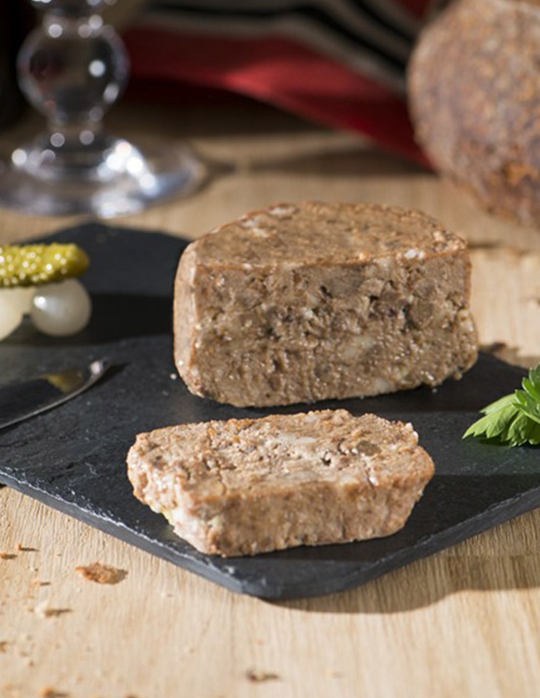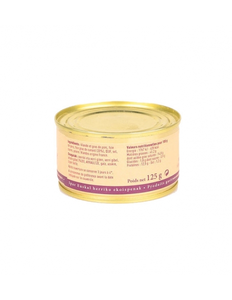 Osagaiak : Xerriki haragi eta urina, xerriki gibela, ahate gibela (20%), arraultza, gatza, sukrea, biper beltza.